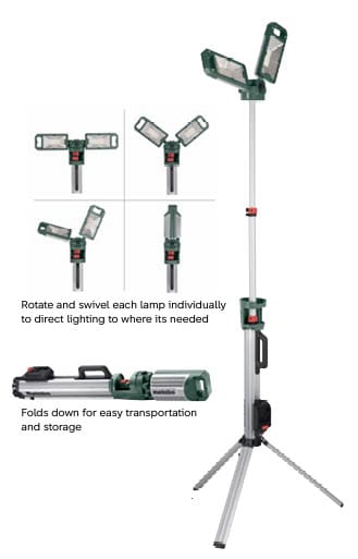 • Twin rotating and swivelling site lights integrated with 2m collapsible tripod