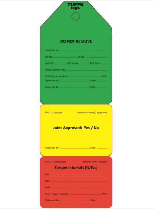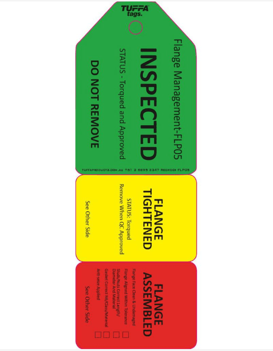 Flange Tags provide quick, clear flange status with their colour coded tear off sections. Proper flange management procedure ensures leak-free start-ups. Flange Tags (also known as Torque Tags) are ideal for pipeline construction, oil & gas operations and energy suppliers. Highly visual at-a-glance torque status that can be customised to comply with flange procedures. Tags can be custom printed to include your company logo or specific information. Tear resistant, water resistant and UV resistant tags that is ideal for flange inspection, joint integrity, breaking containment. We can add your company logo and sequentially numbers for traceability. 100% Recyclable and Australian Made.