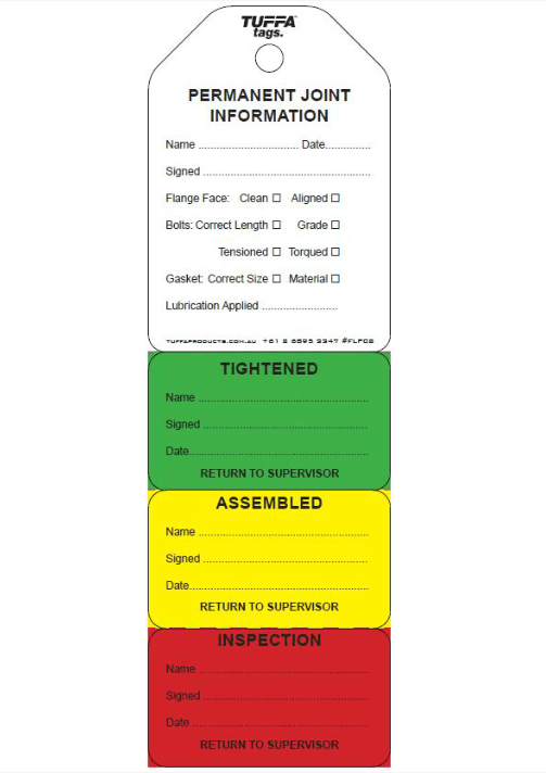 4 Stage Flange Tags provide quick, clear flange status with their colour coded tear off sections. Proper flange management procedure ensures leak-free start-ups. Flange Tags (also known as Torque Tags) are ideal for pipeline construction, oil & gas operations and energy suppliers. Highly visual at-a-glance torque status that can be customised to comply with flange procedures. Tear resistant, water resistant and UV resistant tags that are ideal for flange inspection, joint integrity, breaking containment. We can add your company logo and sequentially numbers for traceability. 100% Recyclable and Australian Made.