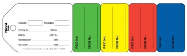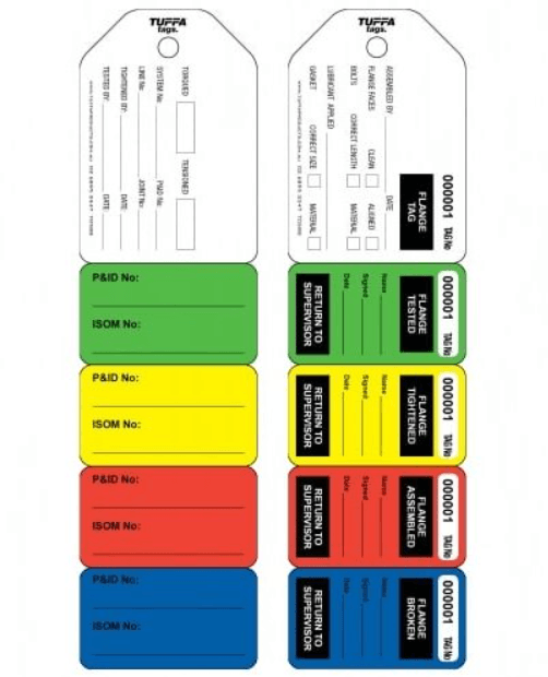 5 Stage Flange Tags provide quick, clear flange status with their colour coded tear off sections. Proper flange management procedure ensures leak-free start-ups. Custom designed to comply with flange procedures. Tear resistant, water resistant and UV resistant tags. Ideal for flange inspection, joint integrity, breaking containment. We can add your company logo and sequentially numbers for traceability. 100% Recyclable and Australian Made.