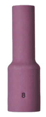 Single long alumina gas lens cup, 13mm (Size 8). For WP-17/18/26 torches. Extended reach. Packed in sealed plastic bag.