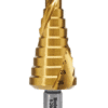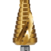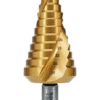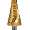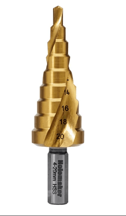 SDL6-38MM HOLEMAKER STEP DRILL, SPIRAL FLUTE, 12 STEPS, 6MM STEP LENGTH, 6 - 38MM Sizes: 6, 9, 13, 16, 19, 21, 23, 26, 29, 32, 35, 38mm Step Length: 5.5mm Overall Length: 101mm Shank Diameter: 12mm $ 245.00 ex-GST