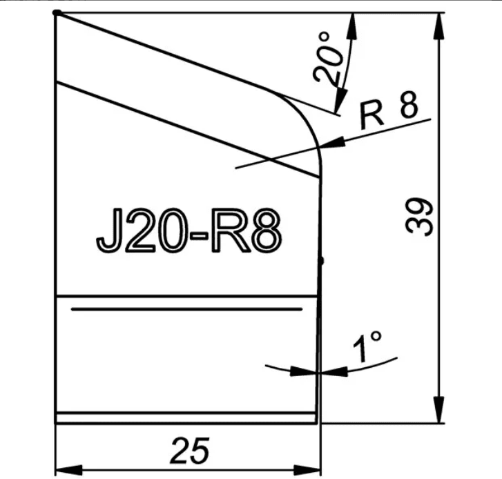 ITM J-BEVELLING TOOL BIT, J20/R8, 20 DEG X 39MM HIGH, 8MM RADIUS TO SUIT PRO5PB BEVELLER
