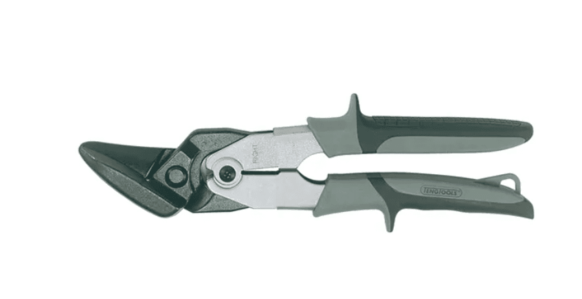 Right/Straight Cut Offset 10″ Tin SnipsCuts up to 1.5mm steel or 0.9mm stainless steelBlade angle designed to cut towards the left/right depending on model when cutting curvesAlso cuts in a straight lineBi-material grip for more comfortable use