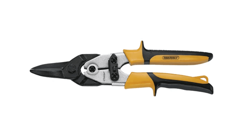 Left/Straight Cut 10″ Tin SnipsChrome molybdenum alloy steel drop forged cutting bladesCuts up to 1.5mm steel or 0.9mm stainless steelSpring loaded high leverage handles for increased cutting capacitySafety lock for safe storageBi-material grip for more comfortable use
