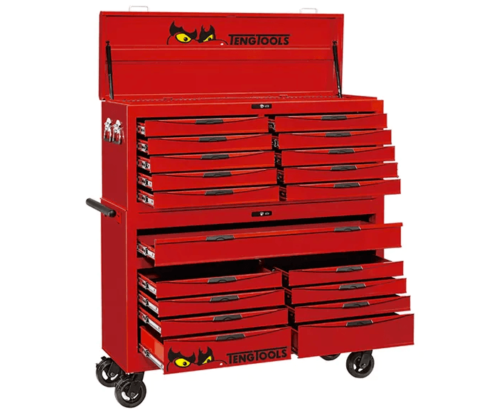 - Supplied in a red TengTools 53″ 19 drawer stack system with 10 drawer top box and the 9 drawer roller cabinet
