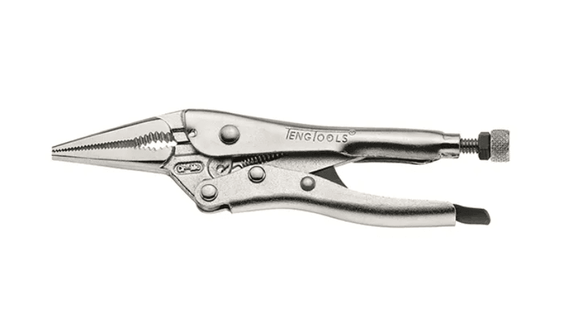 6″ Narrow Long Nose Power Grip PlierNarrow jaw for use in confined spacesSelf locking with non pinch, one handed operation release leverWith locking nut on adjustment knob for pre-setting, ideal for repeated useWire cutter and crimper functionChrome molybdenum