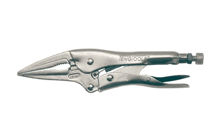 6″ Long Nose Power Grip PlierSelf locking with release leverWith locking nut on adjustment knob for pre-setting, ideal for repeated useWire cutter and crimper functionChrome molybdenum