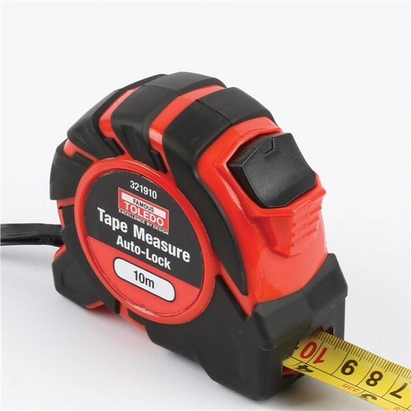 Toledo Measuring Tape 10m x 27mm – Heavy-duty, high-visibility tape measure designed for professional use, featuring a wide blade and durable casing for accurate and reliable measurements.